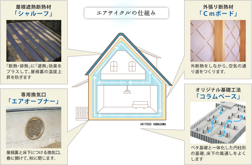 エアサイクルの家の仕組みは単純。建物のまわりをしっかり断熱し、壁の中などの空気が自由に動くようにしています。建物の中の空気を動かす仕組みも、温度差という自然の力を利用したもの。昔ながらの知恵と最新の技術をミックスした"自然体"の工法、それがエアサイクルの家なのです。ちょっとわかりにくいかもしれませんので、ここではもう少し具体的に、エアサイクルの家がなぜ暮らしやすいのか、エアサイクルの家の特徴を5つのポイントにわけてご説明しましょう。